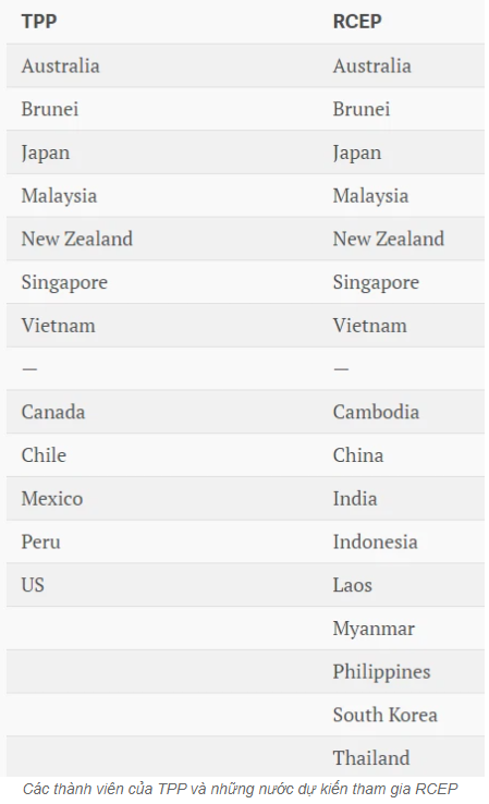 Hiệp định đối tác kinh tế toàn diện khu vực (RCEP) bao gốm 10 nước ASEAN và 6 nước khác như Trung Quốc, Ấn Độ, Nhật Bản, Hàn Quốc, Australia và New Zealand đang trỗi dậy như một bản thỏa thuận thay thế cho hiệp định TPP đang có nguy cơ thất bại.